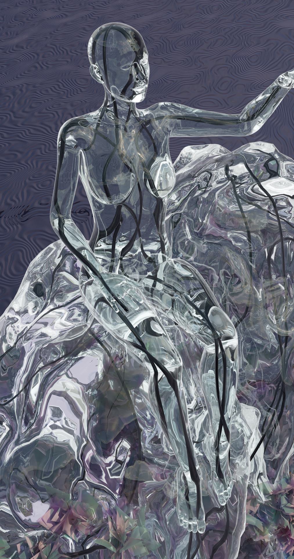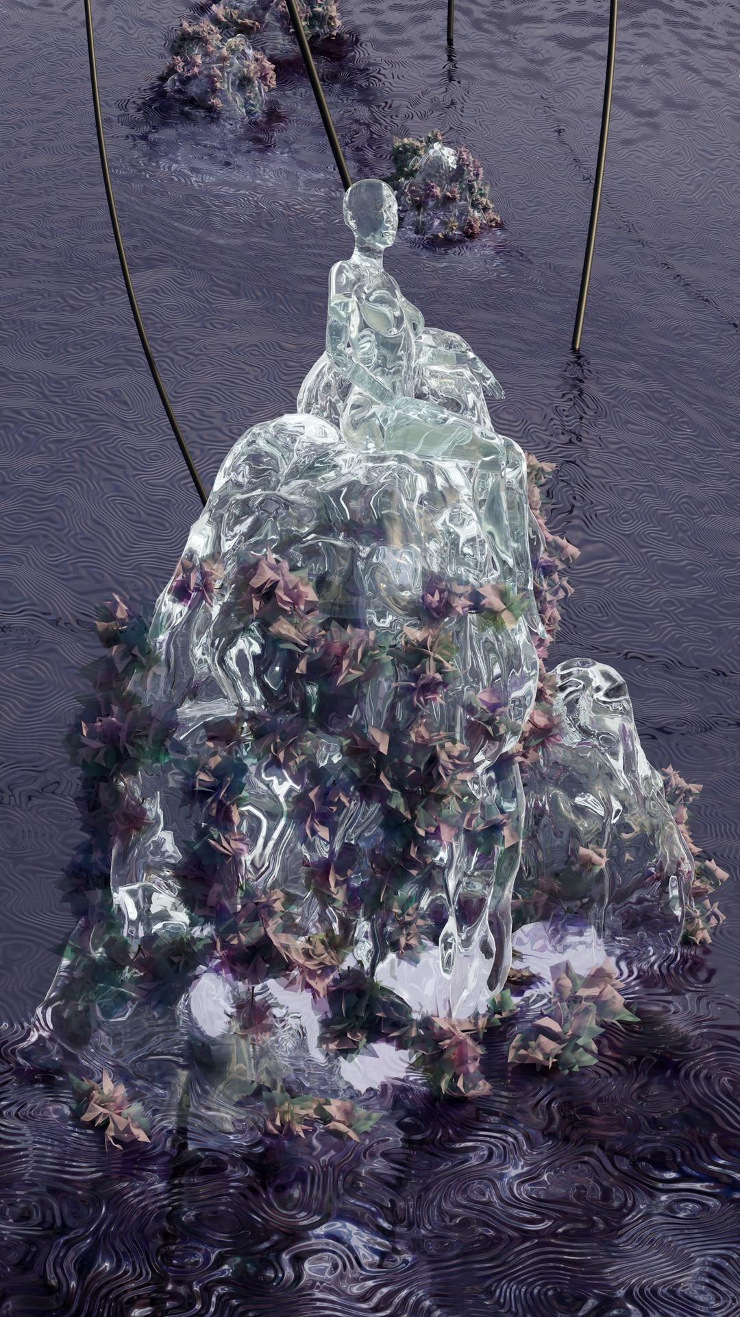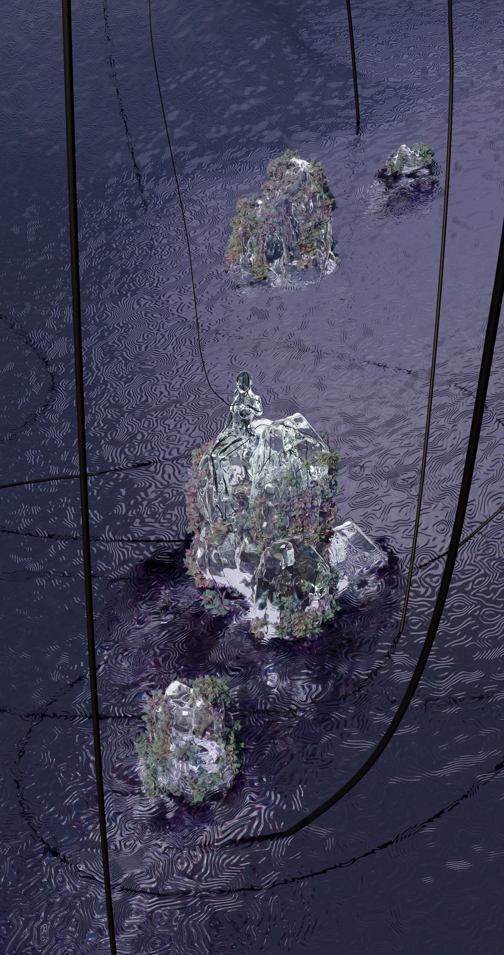 'A Dissolving, A Return' is a work of two 3D animations, combined with a soundscape and spoken word. It portrays two opposing futures, Gaia & Etheria, in which we have stepped away from our human-centric worldview.