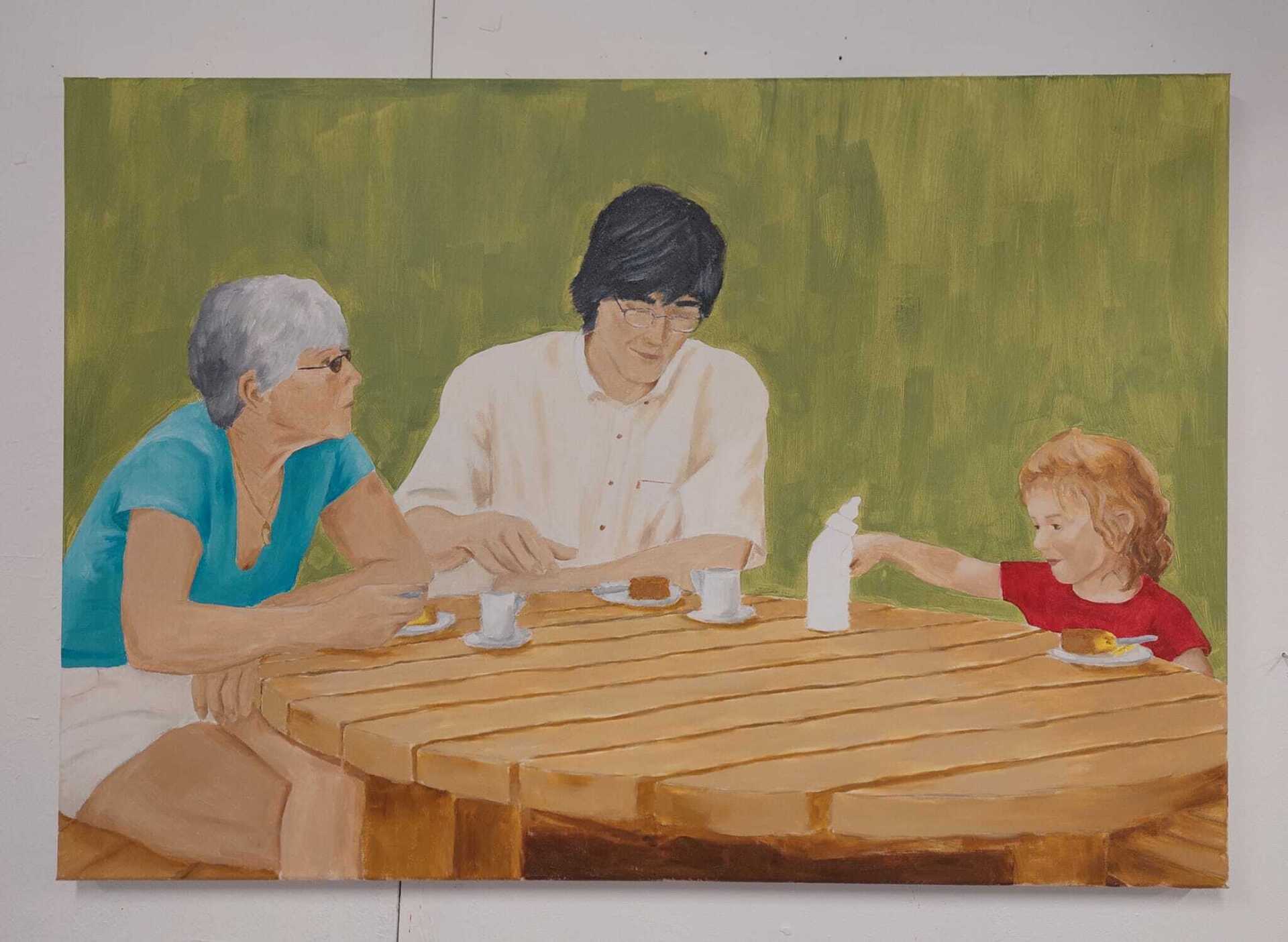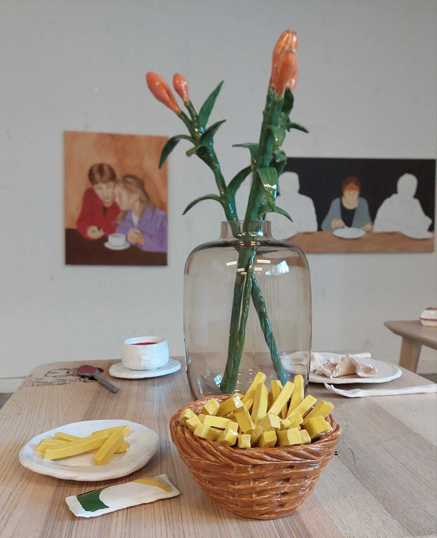 Nathalie van den Berg gebruikt keramiek en schilderkunst als medium om momenten in de tijd te vangen en te bevriezen. Geïnspireerd door oude familiefoto's maakt ze schilderijen van mensen aan tafel, waarbij het eten uit het doek springt en versteend op tafel komt. Naast beeldend kunstenaar positioneert ze zich in de kunstsector als museumeducator, rondleider en workshopdocent.
