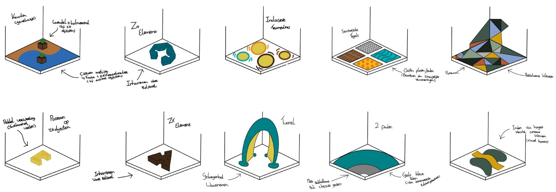 De rolstoelgebruiker stond altijd centraal in dit project. Mijn interesse in zintui- gelijke prikkelverwerking is ontstaan door het contact met de ergotherapeut, wat me heeft doen besluiten om dit als een diepere laag aan het project toe te voegen. Het doel was om zintuigelijke elementen te integreren voor een inclusie- ve en stimulerende omgeving, met name voor rolstoelgebruikers met dubbele ziektebeelden en/of trauma verwerking. De input van diverse stakeholders, heeft bijgedragen aan het ontwikkelen van een ontwerp waarin de waarden tot uiting komen. Hierdoor wordt het gevoel van inclusie bevordert.