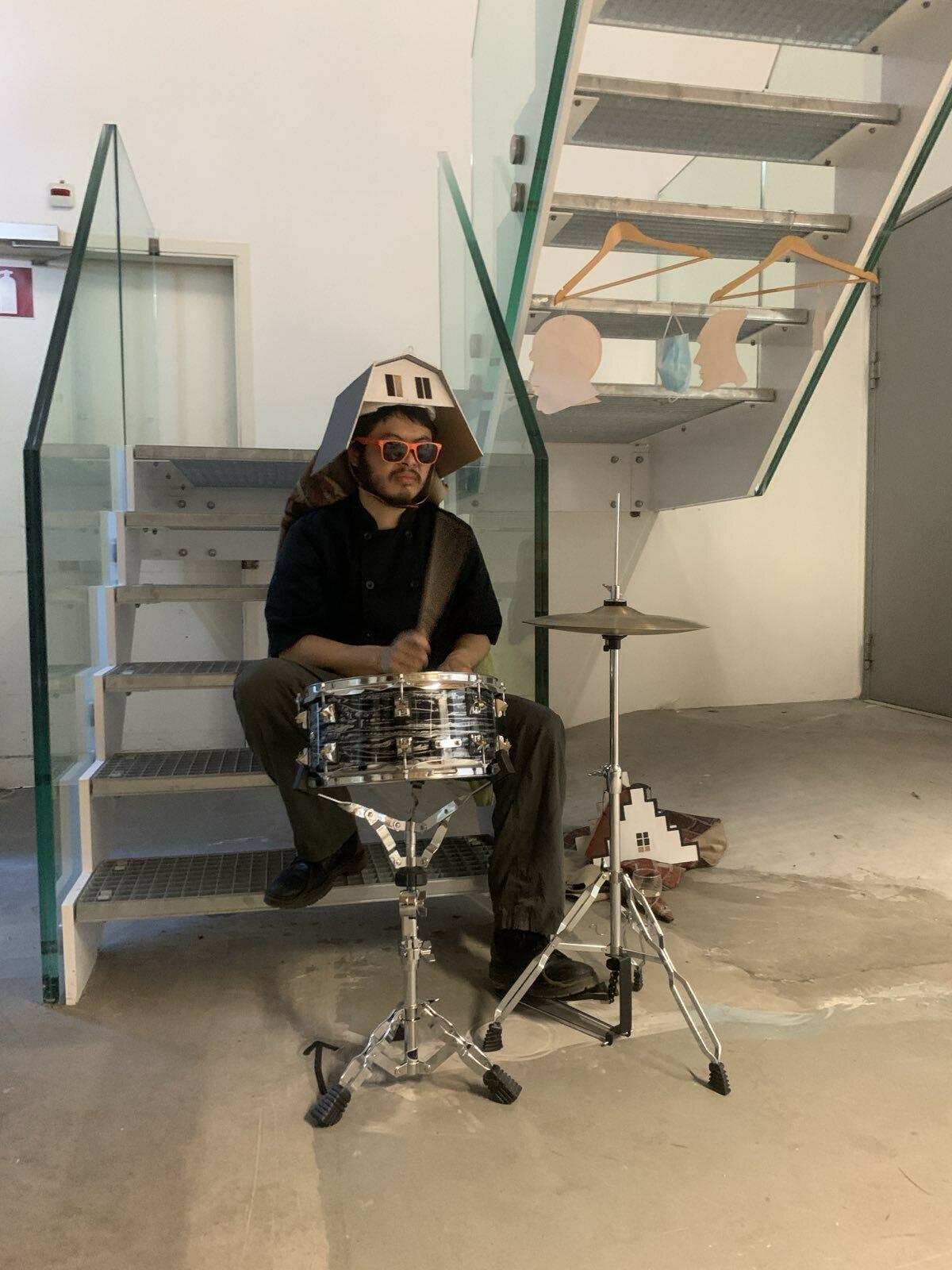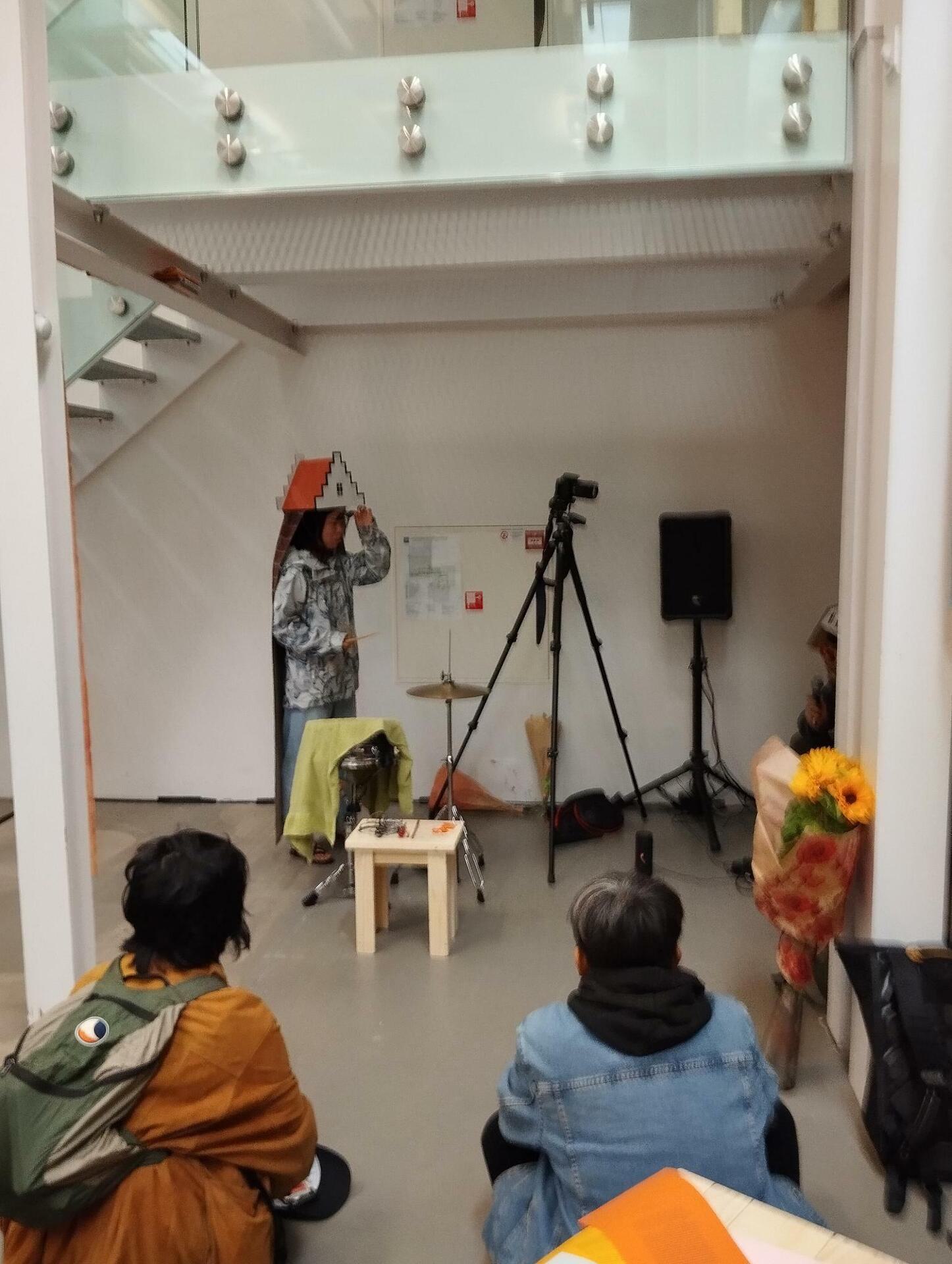 Act 2: Invite a visitor to wear hat that resembles a Dutch house. I also wear another house hat. Then I encourage the participant to sing and repeat part of a song that he/she likes, while I will be playing drums to that song loop.