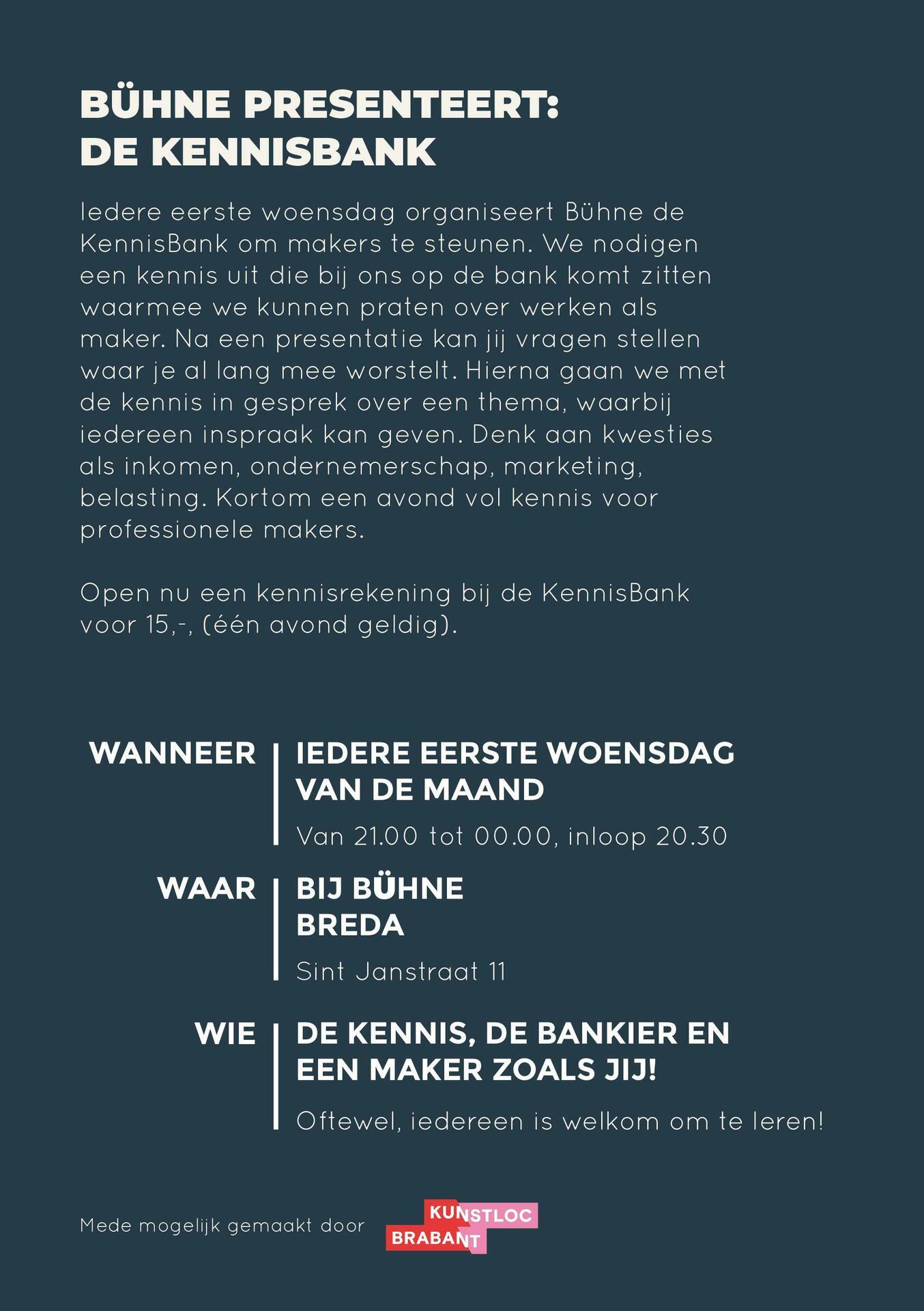 Om makers een steun in de rug te geven op de weg van professionalisering heb ik in opdracht van Bühne Breda en in samenwerking met Kunstloc Brabant de KennisBank gemaakt. Hiermee willen we makers op een laagdrempelige manier laten leren en discussiëren over zakelijke thema's. Denk hierbij aan financiering, marketing of netwerken.