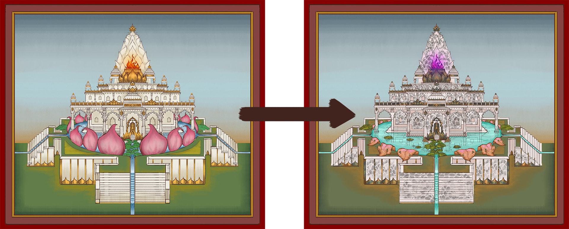 In mijn concept art kun je goed de verschillen tussen de 2 vormen van het paleis zien. De speler ziet dus pas van dichtbij de 'echte' vorm van het paleis die aangetast en verkleurd is.