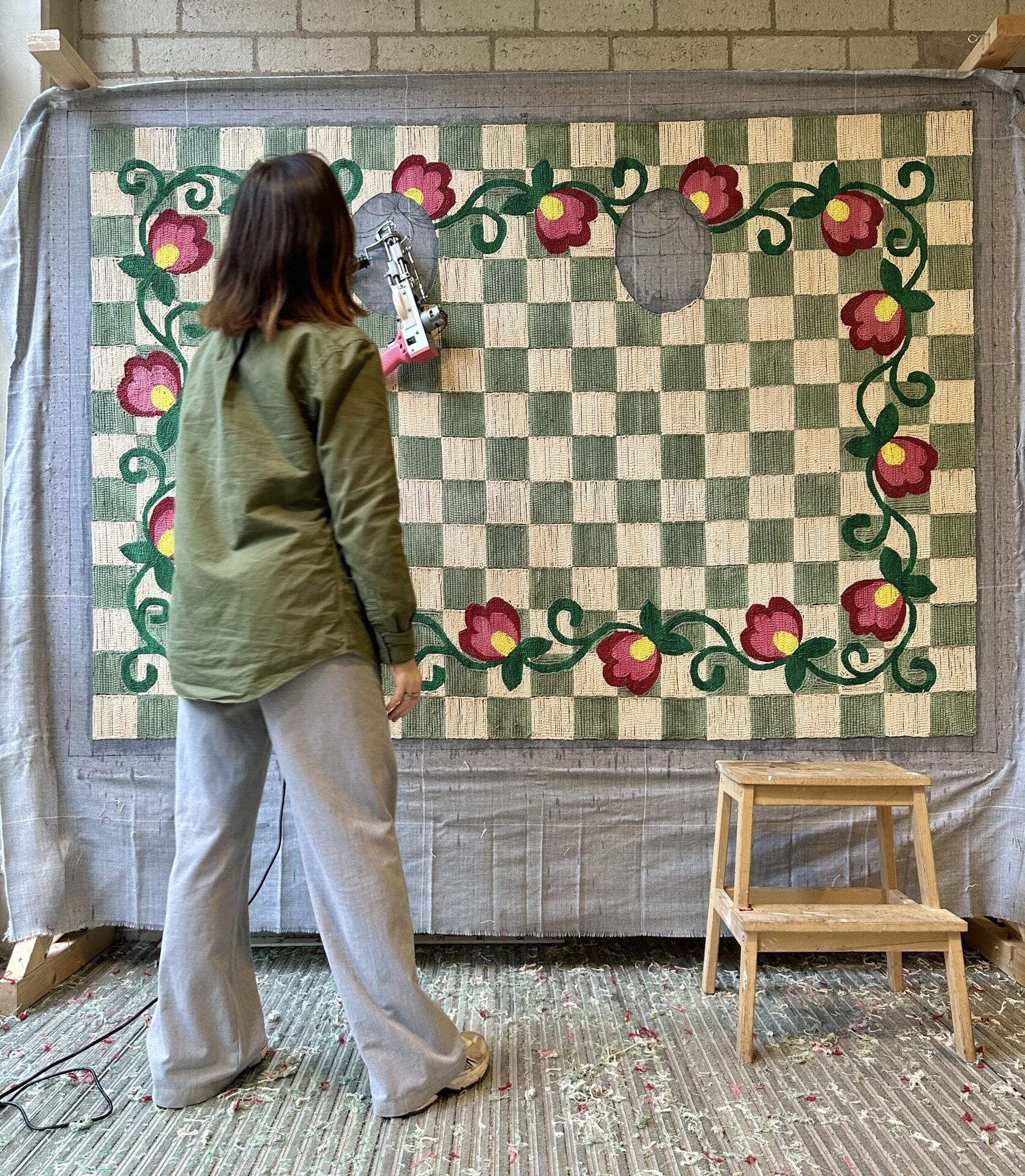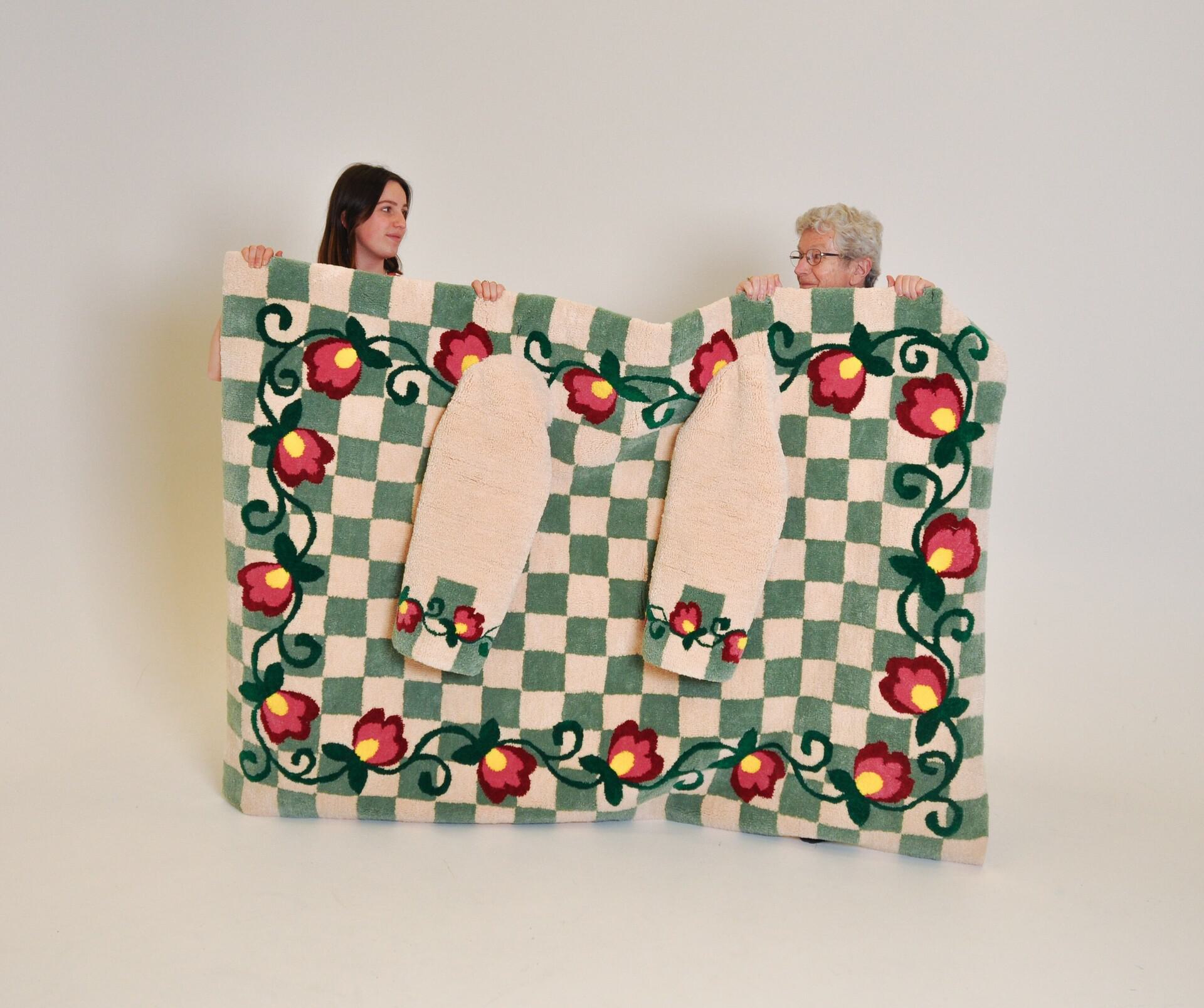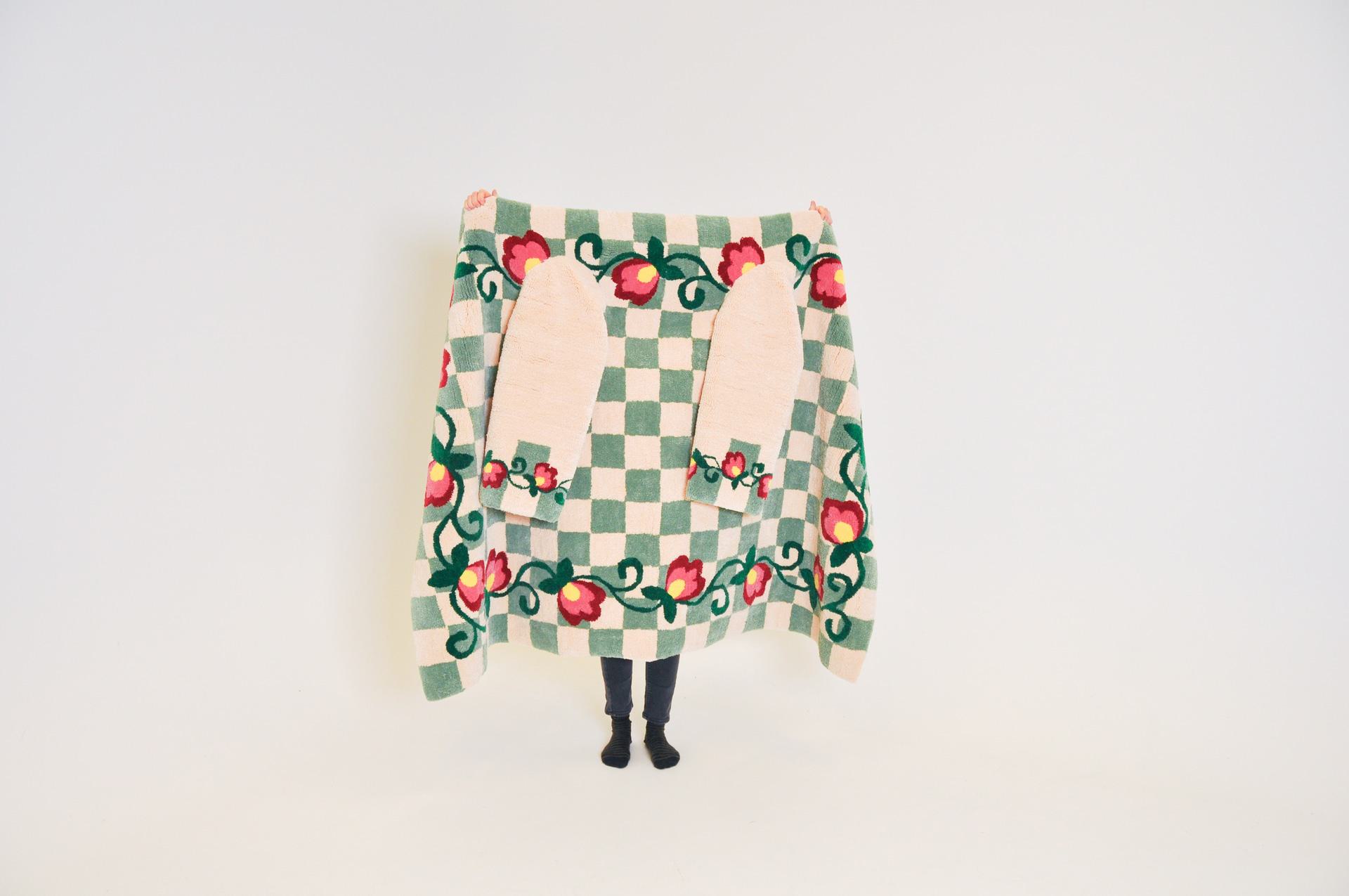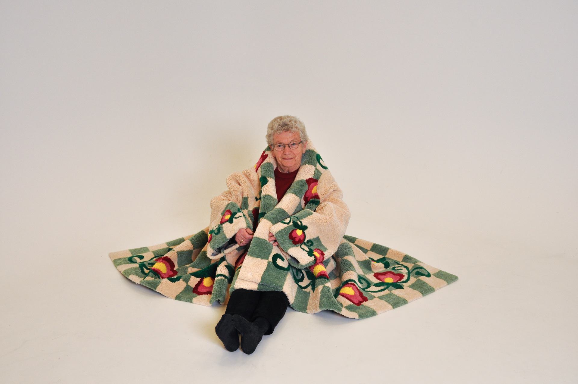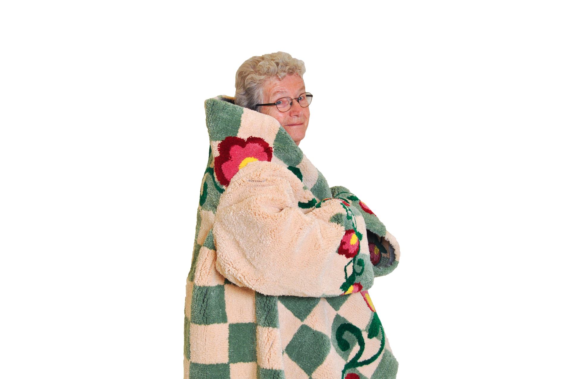 Tuften is voor mij meer dan een techniek. Het is een kunst die geborgenheid en herinneringen oproept. Een vloerkleed zoals wij die allemaal kennen transformeerde ik naar een draagbaar tapijt, ‘een oude ambacht in een nieuw jasje’. Het symboliseert mijn liefde voor textiel die ik deel met mijn voorouders, in het bijzonder mijn oma Gemma. Samen zijn we tot een ontwerp uit die tijd gekomen.