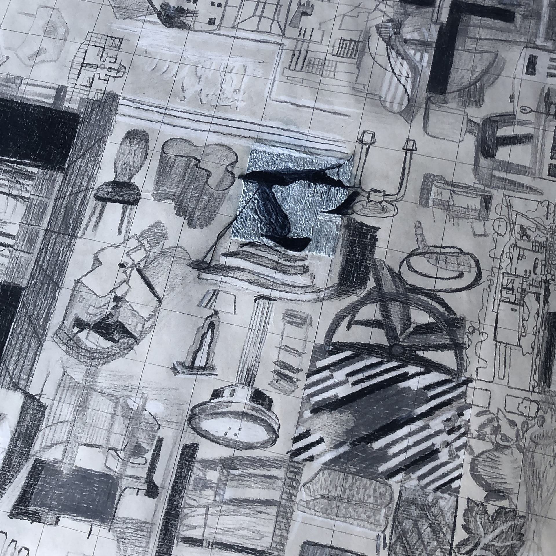 Deze kritiek geef ik weer met de tweede laag die ik langzaamaan mijn tekening toe voeg met denimdraden. Elke draad benadrukt de tijd en de zorg die in een handgemaakt werk zit. Door deze ambachtelijke laag aan te brengen, draai ik als het ware de tijd terug op een periode waarin de industrialisatie van wonen volop in opkomst was.