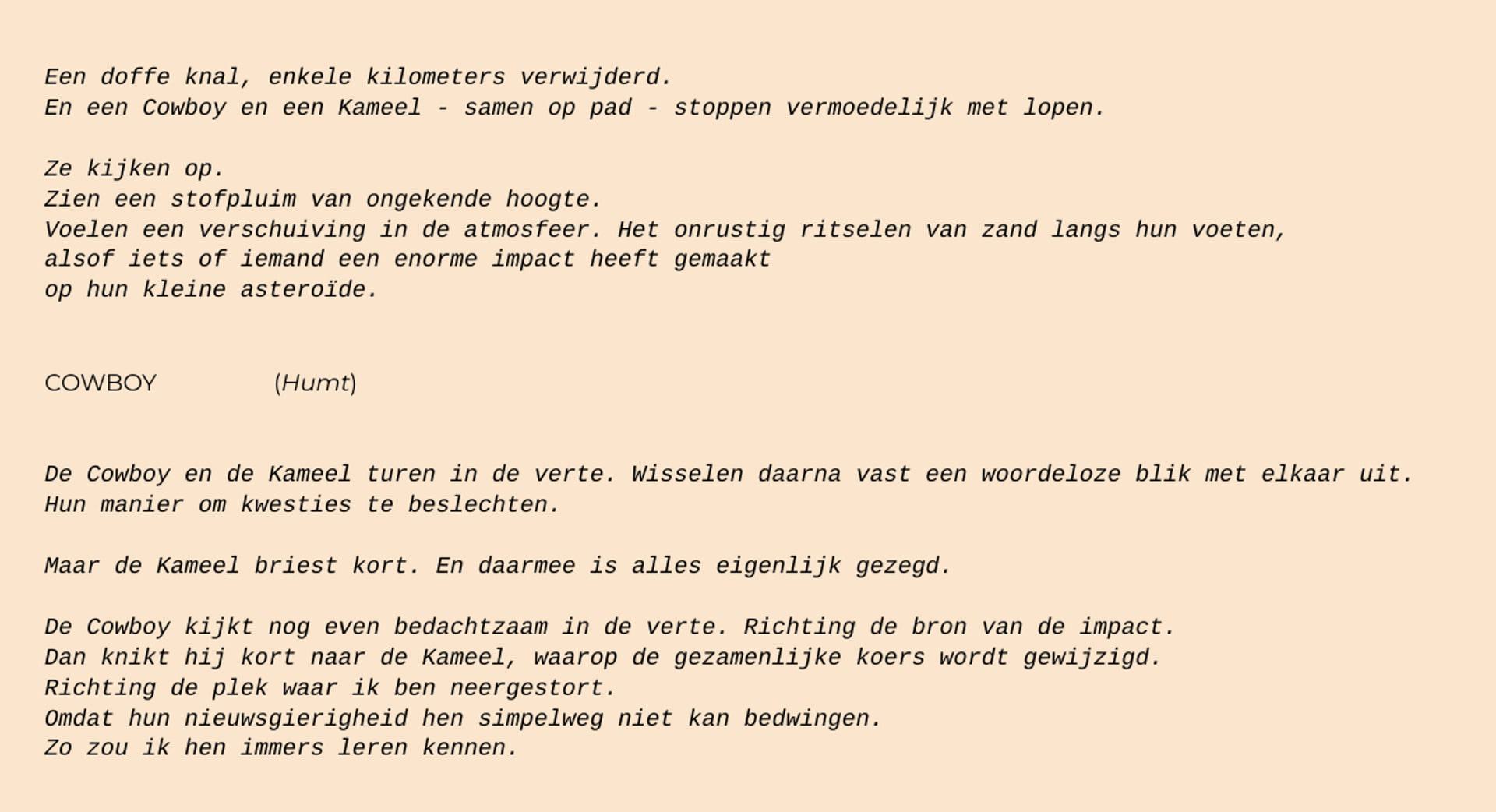 Dit voorjaar heb ik ´Gebakken Lever´ geschreven, een futuristische Hamlet-bewerking vol tijdreizen en lightsabers. Ik schreef dit toneelstuk voor de eindregie van Beaudé Hendriks, van de opleiding ´Theatre and Education.´