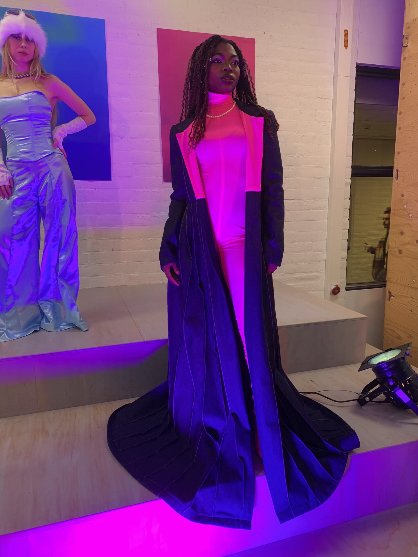 Om bij te dragen aan duurzaamheid, verwerk ik een aanzienlijke hoeveelheid upcycled denim en vintage pakken in mijn ontwerpen. Bovendien geef ik prioriteit aan het maken van proefmodellen met behulp van digitale ontwerpprogramma’s zoals Clo3D en Blender om tijd, energie en, het belangrijkste, stof te besparen.