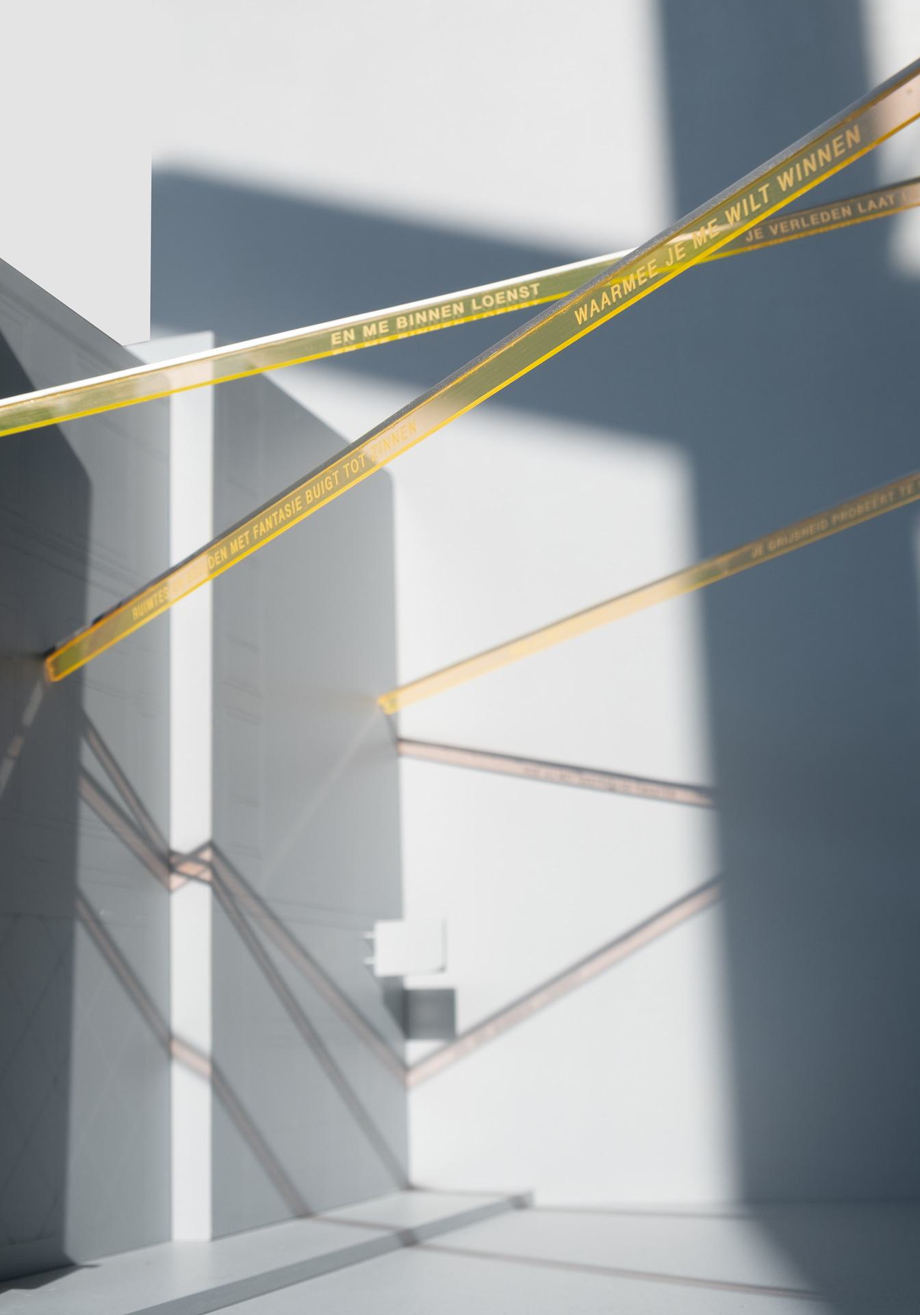 Om het ontwerp eigen te maken, ga ik uit van mijn eigen ervaringen: hoogtevrees. Het was een uitdaging om te proberen mijn eigen angst te overwinnen. Door samen te werken met psychologen werd mijn ontwerp praktisch. In de psychologie hebben ze het over gradual exposure: stap voor stap dichter bij de angst komen. Dit vertaalde ik naar de meerdere lagen ramen die open kunnen en aan de zijkanten dichtgeritst kunnen worden. De patiënt moet alle lagen eraf halen om de angst volledig te ervaren en te overwinnen. De volgende stap zou zijn om meer en meer in de hoogte te bouwen.