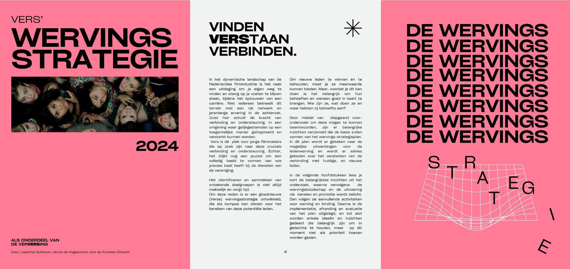 In samenspraak met Vers Film en TV, een vereniging die dezelfde missie deelt en jonge filmmakers wil ondersteunen in hun carrière opzet, is er gekeken naar oplossingen om die verbinding en het bereik te verbeteren. Een effectieve wervingsstrategie is ontwikkeld die is bedoeld als kompas en een consistent, mee-evoluerend onderdeel binnen de bedrijfsvoering van de vereniging. De strategie is gebaseerd op het achterliggend onderzoek en biedt de organisatie inzicht, adviezen en strategieën over hoe het beste de werving op te zetten en nieuwe leden te vinden of verder te verbinden aan Vers.