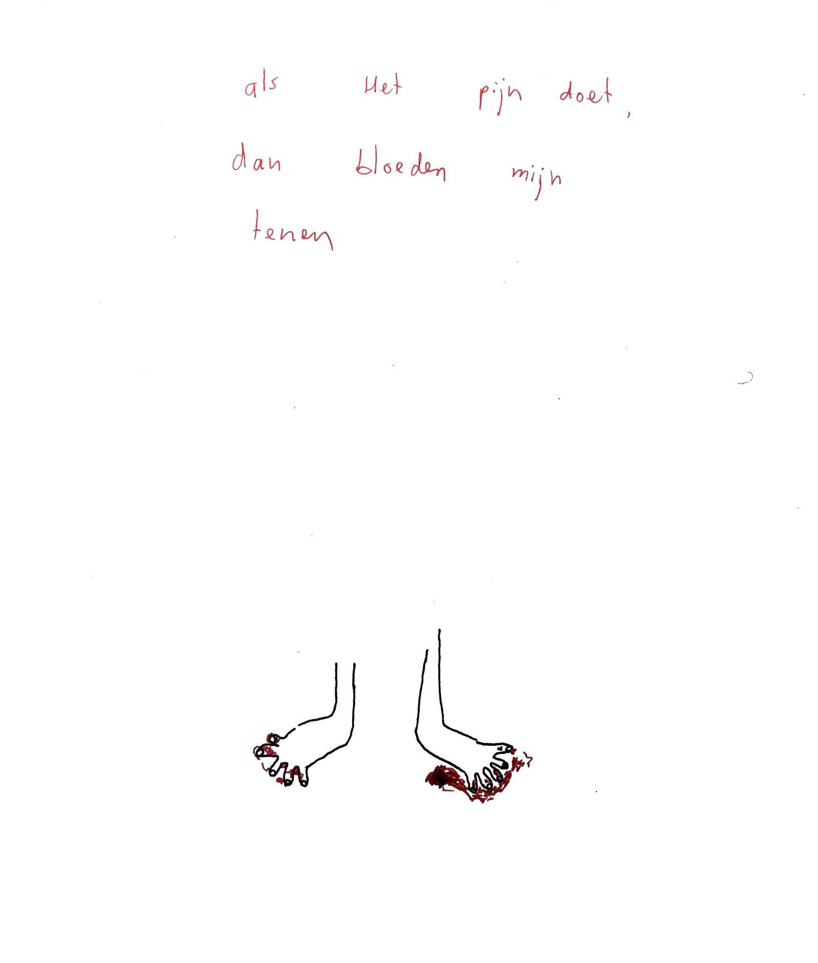 De verhalen die ik schrijf laden mijn installaties en performatieve stukken op, met een betekenis die het persoonlijke ontstijgt. De theatrale performances die ik maak zijn absurd, pijnlijk en zielig. Mijn uitgangspunt zijn observaties uit het alledaagse die ik vervreemd heb tot een absurd, tragisch en emotioneel geheel. Dit lees je dan weer terug in mijn poëzie waar bezieling aan objecten een terugkerend gegeven is. De wens tot interactie en een latent gevoel van eenzaamheid lopen soms hand in hand door mijn studio..
