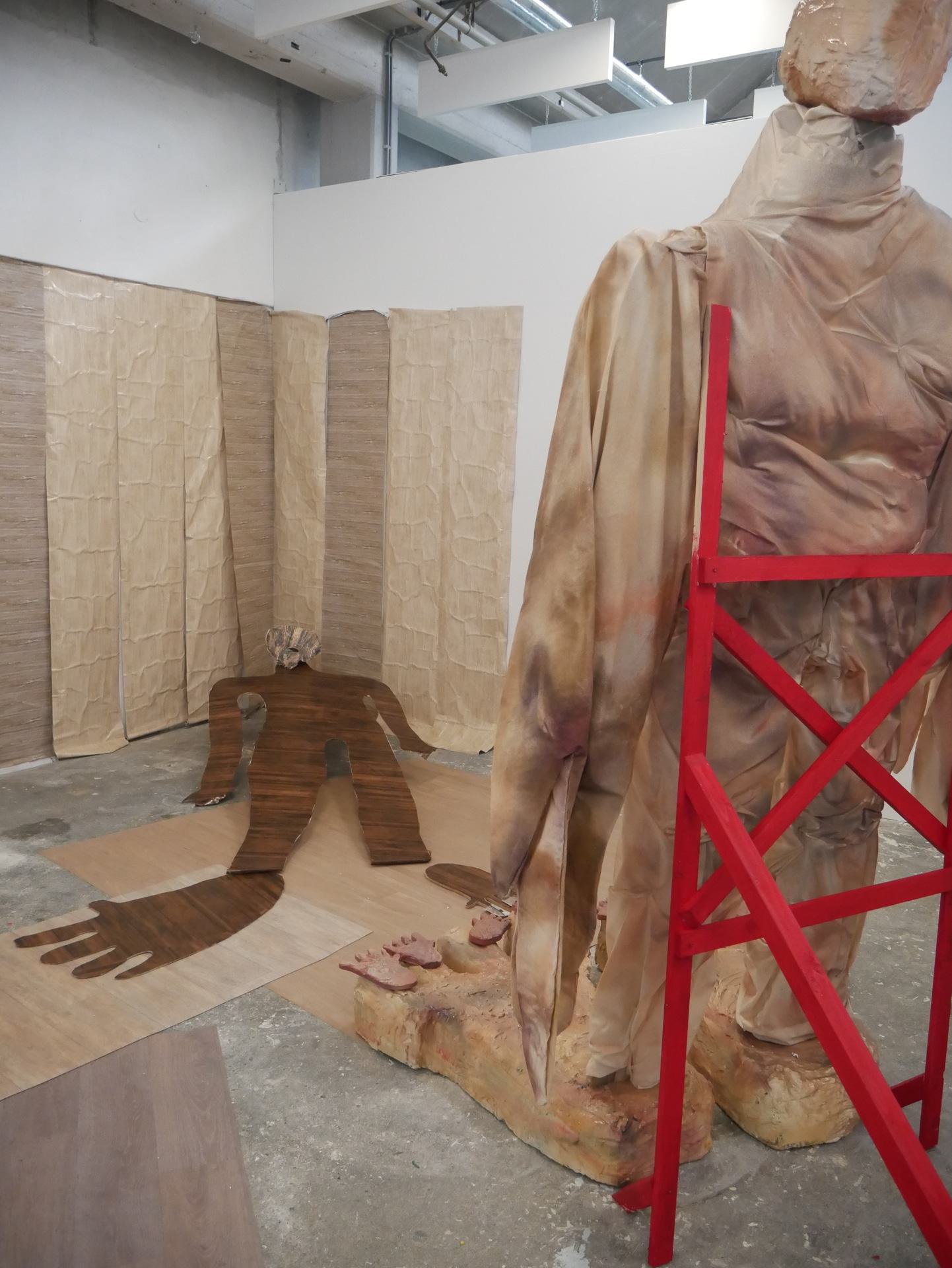De materialen die ik inzet zijn direct en eerlijk: stoffen, spuitverf, gips, hout, schuimrubber, (Nederlandse) taal, geschreven tekst en muziek. Mijn studio is een energieke omgeving waar snelheid en rumoer van belang zijn voor mijn werkproces. Stilte en onnodige complexiteit is er al genoeg.