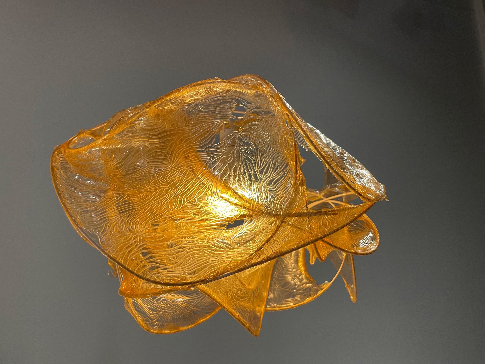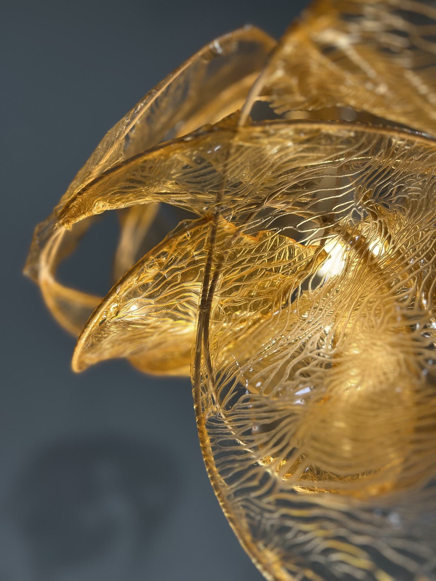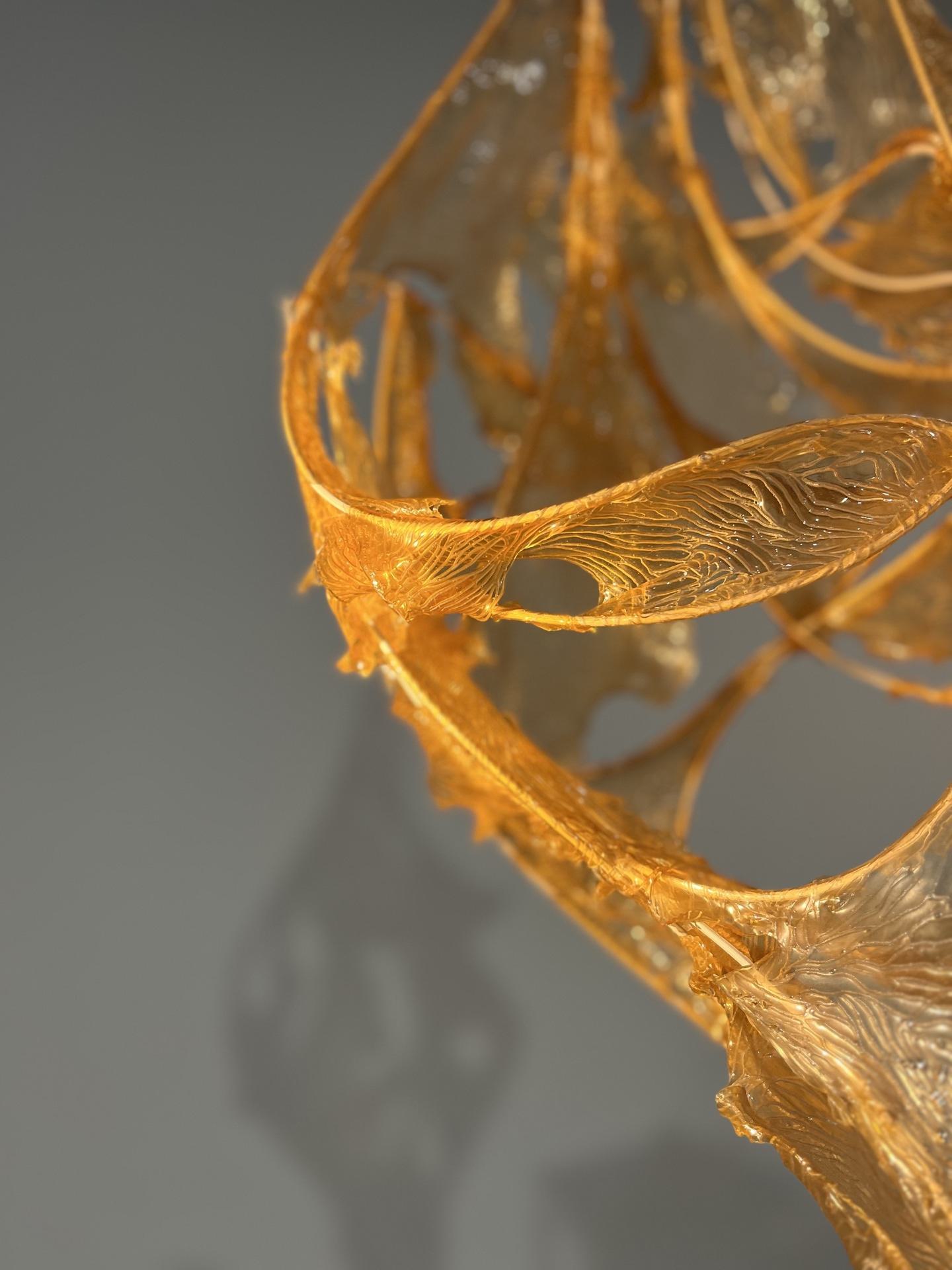 Biomateriaal heeft een unieke eigenschap: tijdens het droogproces krimpt het. Dit natuurlijke gedrag doet denken aan het blad dat zijn vorm aanneemt in zijn laatste stadium van compostering. Hierbij verliest het blad vocht en behoudt het zijn essentie in een nieuwe gedaante.