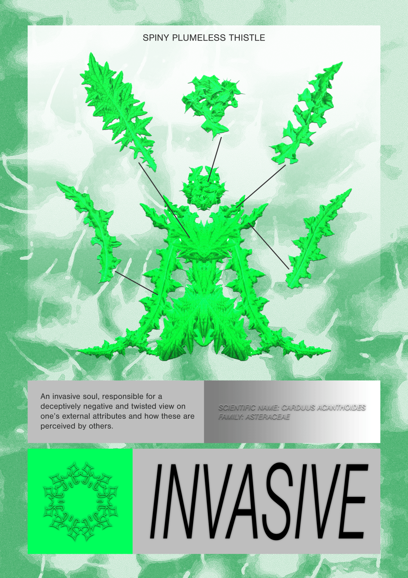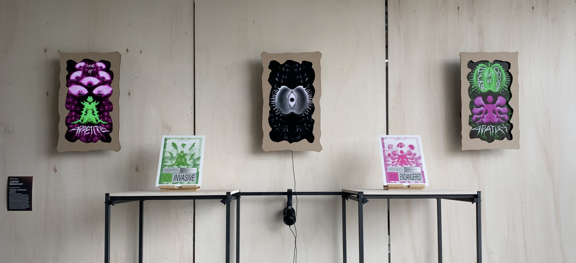 In dit persoonlijke kunstwerk is mijn eigen belevingswereld verbeeld. Door mijn persoonlijke ervaring als jongen met een eetstoornis te delen hoop ik empathie en erkenning te creëren voor andere jongens die worstelen of hebben geworsteld met deze stoornis. In het drieluik is het hoofdpersonage zichtbaar verwikkeld in een innerlijke tweestrijd, tussen levenslust en apathie. Deze innerlijke strijd wordt in stand gehouden door reacties van buitenstaanders en de opdringerige gedachten van het personage. De buitenstaanders zien een gebrek en de opdringerige gedachten bevestigen een negatief zelfbeeld. In het linkerpaneel zijn de benauwende blikken van pesters en bezorgde omstanders uit de buitenwereld zichtbaar. In het rechterpaneel zijn de innerlijke twijfels verbeeld als vleesetende planten. Het middenpaneel vertegenwoordigd de vicieuze cirkel waarin het personage verwikkeld is, door het zelfbeeld en de perceptie van de buitenwereld.